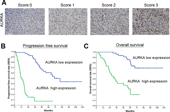 To determine the expression of AURKA, a 4-μm section of each specimen was subjected to immunohistochemical analysis. The primary antibody against AURKA (rabbit anti-Aurora A polyclonal antibody; NOVUS NB100-212) was diluted (1:1500) and applied to the slides, which were then incubated overnight at 4°C. The slides were then washed three times for five minutes in TBST before visualization with the DAKO LSAB2 System-HRP (No K0675, DAKO A/S, Denmark). Control slides were incubated with secondary antibody only. After washing three times for five minutes in TBST, the slides were mounted. We used microscopy to analyze the slides in a blinded fashion. The expression of AURKA in GISTs was scored as either low (0%−29% and 30%−59% staining was scored as 0 or 1, respectively) or high (60%−80% and 81%−100% staining was scored as 2 or 3, respectively) (Figure 1A).