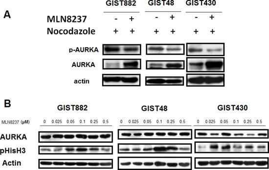 Figure 2: MLN8237 inhibits AURKA and induces mitotic arrest in gastrointestinal stromal tumor (GIST) cell lines. (A) Immunoblotting with an anti-phospho-Aurora A (Thr288) antibody revealed inhibition of AURKA autophosphorylation in GIST cell lines synchronized by exposure to nocodazole and then treated with MLN8237. (B) Immunoblotting of three AURKA-expressing GIST cell lines with an anti-phospho-HistoneH3 (Ser10) (pHisH3) antibody revealed a dose-dependent induction of pHisH3 after treatment with MLN8237 for six days.