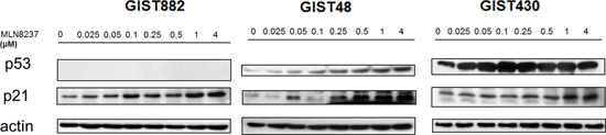 Figure 4: Molecular changes induced by MLN8237 in the p53 pathway were determined by western blotting using gastrointestinal stromal tumor (GIST) cell lines. MLN8237 induced a dose-dependent increase in the expression of p21 in all three cell lines. Dose-dependent up-regulation of p53 could also be seen in GIST48 and GIST430 cells. GIST882 is a p53-negative cell line.