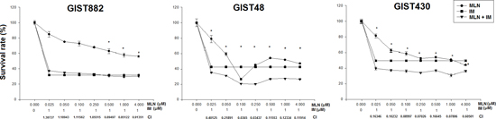 Figure 6: The viability of GIST882, GIST48, and GIST430 cells treated with MLN8237 (MLN) in combination with imatinib (IM) for six days was measured with the TACS™ MTT cell proliferation assay (expressed as a percentage of viability under controlled culture conditions). All data represent the mean ± SD of three independent experiments. *A combination index (CI) < 1.0 indicates a synergistic effect.