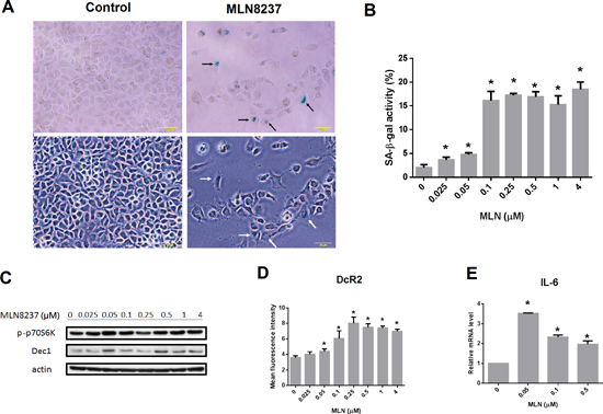 Figure 7: MLN8237 treatment induces cellular senescence in gastrointestinal stromal tumor (GIST) cell lines. (A) Representative photomicrographs of GIST48 cells before and after MLN8237 treatment. Upper panel: images of cells after staining for senescence-associated β-galactosidase (SA-β-gal) activity; lower panel: corresponding bright field images. Scale bar = 50 μm. Some SA-β-gal positive cells are indicated by arrows. (B) Treating GIST48 cells with MLN8237 for six days dose-dependently increased SA-β-gal staining. (C) Western blot analysis of phospho-p70 S6 kinase (p-p70S6K) and DEC1 expression relative to that of actin in GIST48 cells treated with MLN8237. (D) Flow cytometric analysis of the expression of DcR2 in GIST48 cells treated with MLN8237 for six days. (E) Quantitative reverse transcription-polymerase chain reaction (qRT-PCR) analysis of interleukin-6 (IL-6) expression relative to that of glyceraldehyde 3-phosphate dehydrogenase (GAPDH) in GIST48 cells treated with MLN8237. *P < 0.05.