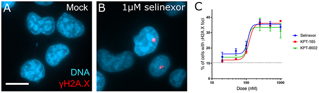 Figure 1: DNA damage foci formation is dose-dependent in response to SINE treatment. (A, B) HT-1080 cells were treated for 8 hours with DMSO (mock) or 1μM selinexor. Cells were fixed and stained for the phosphorylated histone variant γH2A.X (red) and DNA (blue). Prominent damage foci are present in selinexor treated cells. (C) Multiple XPO1 inhibitors show dose-dependent foci formation. Points represent the mean percent of cells at each dose with γH2A.X foci. The dotted line is the mock treated population. Error bars are the SEM from three replicate experiments, at least 100 cells scored in each. Note: The KPT-185 enantiomer KPT-301 does not cause foci formation (not shown). Scale bar in A = 10μm for all panels.