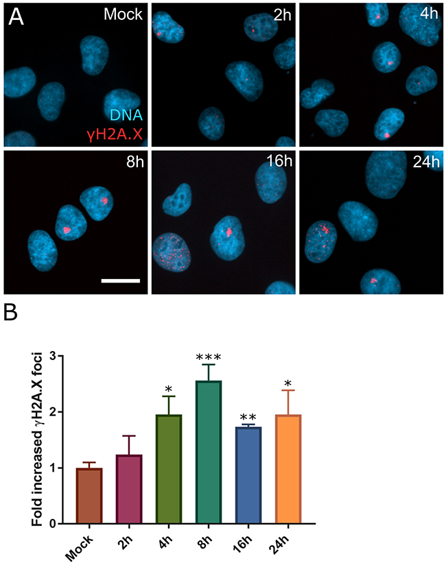 Figure 2: DNA damage foci form rapidly after SINE treatment. (A) HT-1080 cells were treated with DMSO (mock) or 1μM selinexor for 2, 4, 8, 16, or 24 hours (h). Cells were fixed and stained for γH2A.X (red) and DNA (blue). (B) Mean fold increase in cells with γH2A.X foci over mock treated cells for each time point was scored. Error bars are the SEM from three replicate experiments, at least 100 cells scored in each. A Student’s t-test was performed comparing time points to mock treated. *** is p<0.001, ** is p<0.01 and * is p<0.05. Scale bar = 10μm for all panels.