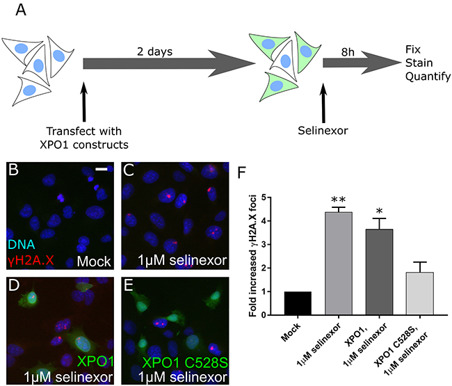 Figure 3: DNA damage foci formation after SINE treatment requires XPO1 binding. (A) Experimental scheme. Cells are transfected, treated, and the DNA damage formation is quantified. (B, C) HT-1080 cells were mock transfected or (D) transfected with XPO1-RFP or (E) XPO1 C528S-RFP expression plasmids. Cells were treated with DMSO (mock) or 1μM selinexor for 8 hours. Cells were fixed and stained for γH2A.X (red) and DNA (blue). Transfected cells are shown in green. (F) The mean fold increase in DNA damage foci over mock was quantified. Error bars are the SEM from two replicate experiments, at least 50 cells scored in each. ** is p<0.01 and * is p<0.05 compared to mock. Scale bar in B = 10μm for all panels.