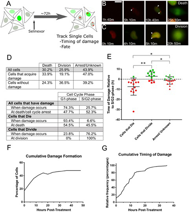 Figure 5: Live cell tracking of SINE treated cells reveals cell cycle associated DNA damage and cell fates. (A) Experimental scheme. HT-1080 cells that express mAG-hGem(1/110) and mCherry-BP1-2 were treated with 1μM selinexor and imaged every 10 minutes (m) for 72 hours (h). DNA damage foci formation, cell cycle stage and cell fate were analyzed. (B, C) Representative examples of cells that acquire DNA damage foci are presented. (B) This cell acquires damage 5h 10m after treatment. The cell then enters S-phase (accumulation of mAG-hGem(1/110) probe) at 10h 40m and dies at 25h 10m. (C) The second example enters S-phase at 4h 10m, acquires damage foci at 5h 10m and progresses to cell division at 20h 50m. White arrows indicate DNA damage foci. (D) Tables summarize the fate and cell cycle stages of 189 individually tracked cells. Over 70% of cells that become damaged, are damaged in G1-phase (absence of mAG-hGem(1/110) probe). For cells that die, over 90% are damaged in G1-phase, those cells that acquire damage and progress to cell division become damaged in S/G2-phase. (E) Cells that progress to S/G2-phase were analyzed to determine the timing of DNA damage accumulation in relation to the S/G2-phase transition and cell fate. The dotted line is S/G2-phase entry, designated time=0. Each point is an individual cell. The bars are the mean with standard deviation. Cells that become damaged and die in S/G2-phase are typically damaged several hours before S/G2-phase entry, where those that become damaged but divide are damaged shortly before or after S/G2-phase entry. ** is p<0.01 and * is p<0.05. (F) Cumulative damage formation within the entire tracked population. Nearly 50% of all cells acquire damage, mostly by 15h after treatment, and approximately 36% after 8h, in good agreement with fixed cell experiments. (G) The cumulative timing of damage for all cells that acquire damage is displayed. Damage formation is rapid until approximately 15h and slower thereafter. Scale bar in B = 10μm for all panels.