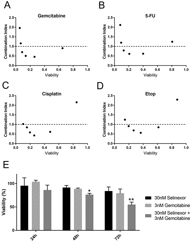 The nucleoside analogs gemcitabine and 5-FU show strikingly similar combination effects across the dose combinations tested (Figure 6A, 6B). Gemcitabine shows combination indices <1.0 for the four lowest concentration combinations. We chose concentrations that were approximately half the EC50 to characterize the selinexor– gemcitabine combination over time (30nM selinexor, 3nM gemcitabine) (Figure 6E, Supplementary Figure 9A). As single agents, there is no significant decrease in cell survival by 72 hours compared to untreated. The combination has a significant decrease in viability compared to untreated cells at, with an approximate 25% decrease in survival at 48 hours, and nearly a 50% decrease at 72 hours (Figure 6E).
