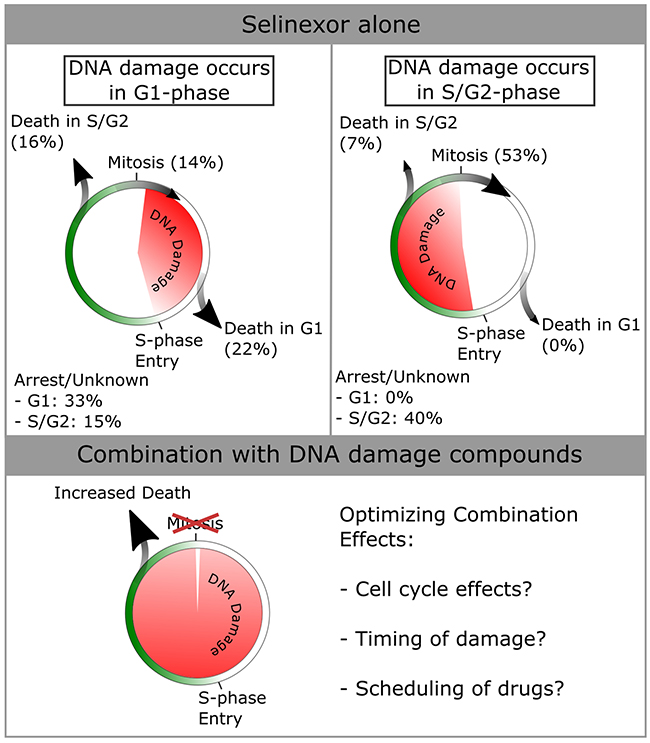 DNA damage after treatment with SINE correlates with cell death in 34% of the cells, other cells appear to repair the damage and continue proliferation or undergo cell cycle arrest, and still others show no DNA damage, but also die or arrest (Figure 5, e.g. Supplementary Videos 3, 4, and 6). Cell fate appears to be dependent on the timing of DNA damage, with death occurring most often in cells that acquire damage in G1-phase (38%) compared to those that acquire damage in S/G2-phase (7%) (Figure 7). These features of the response to SINE may enable the combination effects found when SINE is combined with different classes of DNA damage agents. Combination treatments are an essential part of anti-cancer therapies and are an important part of future research (Figure 7). Of note, gemcitabine, platinum-based agents, topoisomerase inhibitors and PARP1 inhibitors are each being evaluated with selinexor in clinical trials (NCT02178436, NCT02269293, NCT02299518, NCT02419495, ClinicalTrials.gov). Our data suggest that SINE combined with DNA damaging drugs may significantly decrease cell survival and, optimistically, some combination will result in a stronger initial response in cancer therapy.