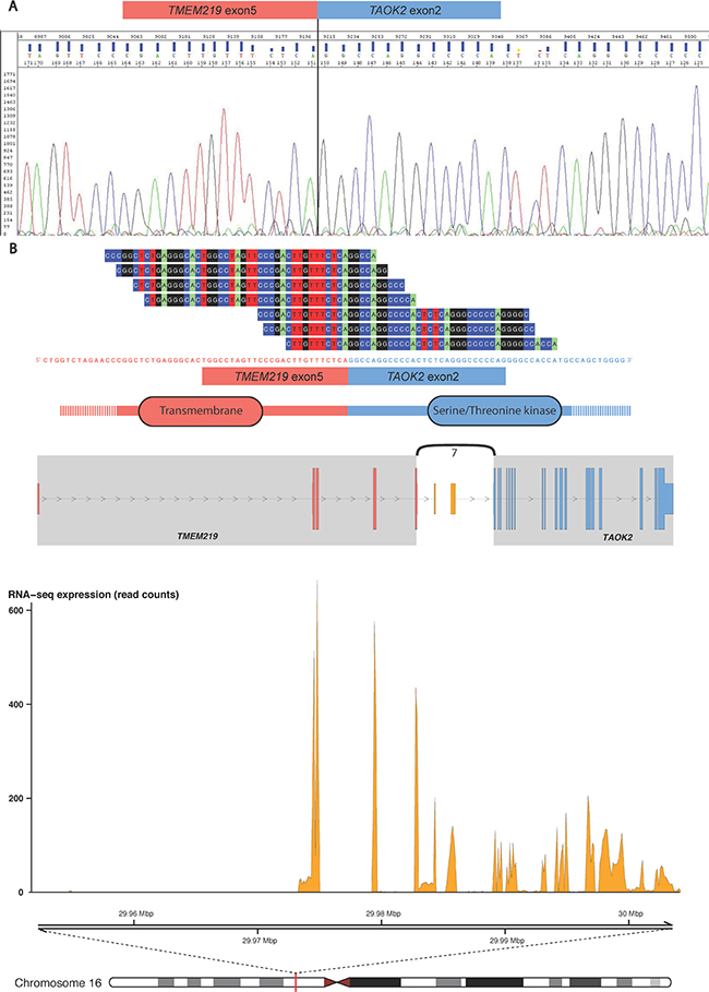 Figure 2: The TMEM219-TAOK2 fusion transcript. (A) The fusion transcript was detected from the VCaP, DU145, PC3, 22Rv1, NCI-H660 and LNCaP cell lines (see Supplementary Table 2), and the specific breakpoint was verified by Sanger sequencing. (B) Example data from the TCGA prostate tumor “TCGA-HC-7211-01A-11R-2118-07” shows seven split reads spanning the chimeric transcript breakpoint, from exon 5 of TMEM219 (ENST00000414689) to exon 2 of TAOK2 (ENST00000279394). The fusion transcript is predicted to include an in-frame open reading frame encoding a chimeric protein with the combination of transmembrane and serine/threonine kinase domains. The genomic view of the fusion event is from the top showing annotated exons of the fusion partner genes and the number of split reads supporting breakpoint (curved line), the RNA expression levels (read counts), and genomic coordinates for the fusion transcript in mega base pairs from the p-telomere of chromosome 16.
