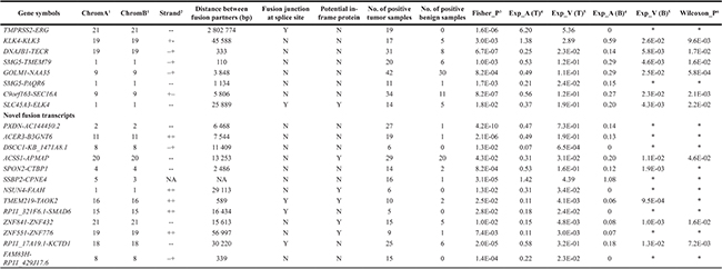Several specific filtering steps were further applied for reducing the number of false positives based on statistics data mining: 1) fusions had to be present in at least five tumor samples; 2) the number of fusions was enriched in tumors compared to that in benign prostates (p < 0.05; Fisher’s exact test); 3) if fusions present in more than two benign prostates, they were retained only when the expression level was higher in tumor as compared to normal (p < 0.05; Wilcoxon signed rank test); 4) the ratio of multi-mapping spanning reads to total spanning reads should be less than 0.6 (i.e. the control of possible ambiguous mapping on both sides of the predicted breakpoints); 5) both gene partners of fusion transcripts had to be either protein-coding, lincRNA or miRNA genes, and putative fusions between overlapping genes were discarded. All fusion candidates nominated by these procedures were manually reviewed in the UCSC Genome Browser by BLAT (http://genome.ucsc.edu/cgi-bin/hgBlat?command=start) to double-check the sequence specificity in breakpoint region.