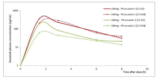 PK sampling was assessed at six time points (before and 1.5, 3, 6, 8 and 24 hours (h) after dasatinib administration) on days (D) 2, 18 and 32 of the first cycle and on D1 of the second and third cycles. After protocol amendment, PK samples on the second and third cycles were reduced and were obtained only at three points: before, 6 and 8 h post-administration.