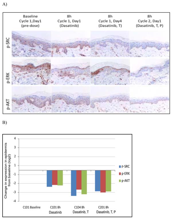 Immunohistochemistry (IHC) expression analysis of phosphorylated (p) p-SRC, p-ERK, p-AKT and total SRC, ERK and AKT proteins were performed in Formalin-Fixed Paraffin-Embedded (FFPE) sequential skin samples at three time points on cycle (C) 1 (D1, before and 8 h after dasatinib administration and D 4, 8 h post-treatment), and one time point on C 2 (D 1, 8 h post-treatment). Same analysis was determined in baseline FFPE tumor samples. The antibodies used were: anti-SRC (rabbit monoclonal SRC antibody clone 36D10, CST, Beverly, MA), anti-p-SRC (rabbit polyclonal SRC Tyr527 antibody, CST), anti-ERK1/2 (rabbit monoclonal p44/42 MAPK antibody clone 137F5, CST), anti-p-ERK1/2 (rabbit monoclonal phospho-p44/42 MAPK Thr202/Tyr204 antibody clone D13.14.4E, CST), anti-protein kinase AKT (rabbit monoclonal antibody clone 11E7, CST) and anti-p-protein kinase AKT (rabbit monoclonal AKT Ser473 antibody clone D9E, CST). All assays were determined on 4 µm tissue sections by immunohistochemistry using a Dako Link Autostainer. Heat antigen retrieval was carried out in pH 9 EDTA-based buffered solution in a Dako Link platform. Endogenous peroxidase was quenched. Primary antibody-antigen reaction was detected by incubation with appropriate polymers coupled with peroxidase (Flex+; Dako). Sections were visualized with 3,3#-diaminobenzidine (DAB) and counterstained with Hematoxylin. Same sections incubated with non-immunized serum were used as negative controls. As positive control, sections of human tumors with known marker expression were used.