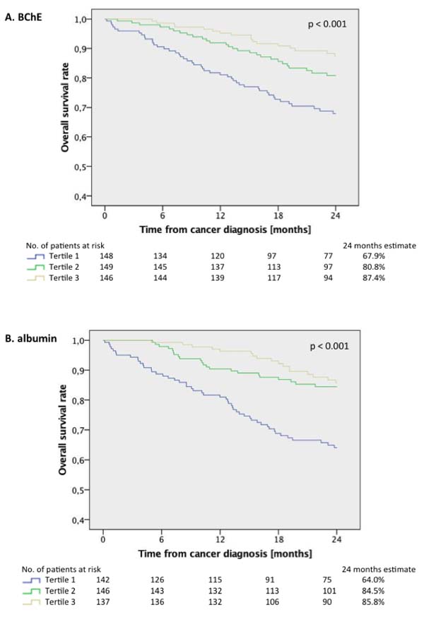 Figure 1: Overall survival rates for treatment-naïve cancer patients without hepatic involvement (n = 453) according to tertiles of (A) butyryl-cholinesterase (BChE) and (B) albumin for a follow-up period of 24 months (p < 0.001 between all groups, log-rank test).