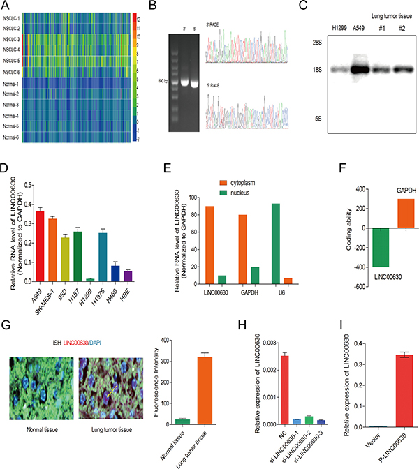 Figure 1: Screened Linc00630 significantly up-regulated in NSCLC from the microarray. (A) Hierarchical clustering analysis of the top 470 lncRNAs that were differentially expressed (> 2-fold; p < 0.05) between NSCLC samples (tumor) and paired non-tumor samples (NT, non-tumor). (B) 5′ RACE and 3′ RACE to identify the full-length of linc00630 in A549 cells. Left, representative images and the boundary of the PCR products from. Right, the nucleotide sequence of full-length human linc00630 in A549 cells. (C) Northern blot for detected the full-length of linc00630, incubation of total RNA from A549. (D) linc00630 RNA levels of in NSCLC cell lines. β-actin served as the control. Values are expressed as mean ± SEM, n = 3. (E) Relative subcellular distribution of linc00630 in NSCLC cells, determined by qPCR. U6 served as the nuclear internal control, β-actin served as cytoplasmic internal control. (F) PhyloCSF software prediction for the protein-coding potential of linc00630. (G) ISH assay to determine the subcellular location of linc00630 in NSCLC tissues. (H) The efficiency of three independent siRNA for linc00630 silencing. (I) The fold change of overexpressed linc00630 by eukaryotic expression vector. Values are expressed as mean ± SEM, n = 3.