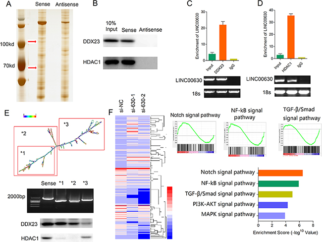 Figure 4: Linc00630 associates with HDAC1 and DDX23 in NSCLC cells. (A) Silver stained SDS-PAGE gel of proteins pulldown from A549 cell extract by linc00630 and its antisense RNA. The arrow indicates the region of the gel excised for mass spectrometry. (B) Western blot analysis detected the specific association of HDAC1 and DDX23 with linc00630 (n = 3). (C, D) RIP experiments were performed using the HDAC1 antibody (C) and DDX23 antibody (D) for immunoprecipitation (IP) and a primer to detect linc00630. RIP enrichment was determined relative to the input controls (n = 3). (E) Western-blot to detect the binding site of HDAC1 and DDX23 with linc00630 by deletion mapping of the linc00630 in A549 cells. (F) Gene expression profiles from A549 cells transfected with the linc00630 siRNAs or the control. Gene set enrichment analyses used to identify the differential gene profiles, between A549 cells transfected with the linc00630 siRNAs and the control. Values are expressed as mean ± SEM, n = 3.