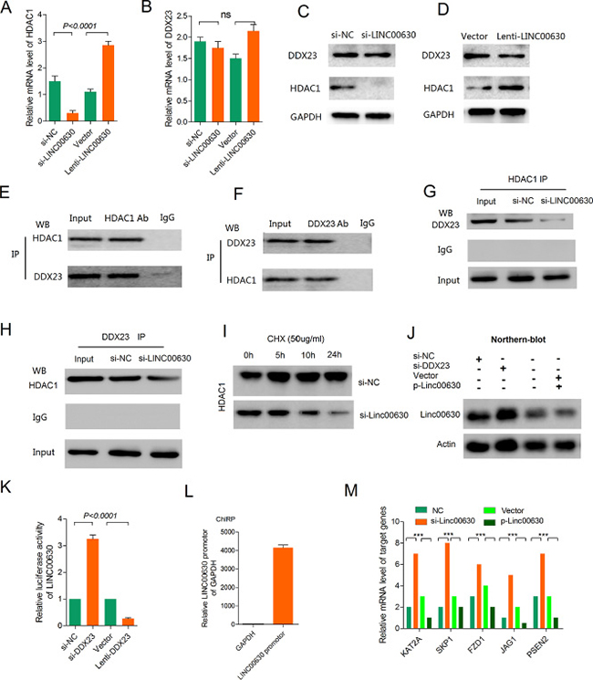 Figure 5: Linc00630 stabilized HDAC1 and it’s the direct target of DDX23 in NSCLC cells. (A–B) QPCR detected the mRNA level of HDAC1 (A) and DDX23 (B) when knockdown or overexpressing linc00630 in A549 cells. (C) Western blot to detect the protein level of HDAC1 and DDX23 when knockdown of linc00630 in A549 cells. (D) Western blot to detect the protein level of HDAC1 and DDX23 when overexpressing of linc00630 in A549 cells. (E–F) Co-immunoprecipitation to detecte whether HDAC1 could binding with DDX23 in A549 cells. (G–H) Knockdown of linc00630 could abolish the binding state of HDAC1 and DDX23. (I) Knockdown of linc00630 in A549 cells and control cells were incubated with the protein synthesis inhibitor cycloheximide (CHX, 0.5 μg/μl) for 24 hours. (J) Northern blot to detect the RNA level when knockdown or overexpressing of DDX23. (K) Luciferase assays for SMMC-7721 cells infected with the lentivirus expressing DDX23 or transfected with DDX23 siRNAs. (L) The enrichment of linc00630 promoter by ChIRP assay. (M) The key genes of Notch pathway were regulated by linc00630. Values are expressed as mean ± SEM, n = 3. Values are expressed as mean ± SEM, n = 3.