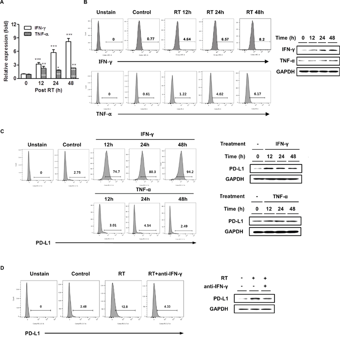 Figure 2: Radiation increased IFN-γ and TNF-α expressions and IFN-γ was correlated with radiation-induced PD-L1 expression in HCC cells. HCa-1 cells were treated with 10 Gy radiation. IFN-γ and TNF-α expressions were measured by (A) real-time PCR, (B) flow cytometry and western blotting (* P<0.05, ** P<0.01, *** P<0.001, one-way ANOVA). GAPDH was the loading control. HCa-1 cells were treated with IFN-γ (20 ng/ml) or TNF-α (20 ng/ml) for the indicated times. PD-L1 expression was analyzed by (C) flow cytometry and western blotting. Anti-IFN-γ antibody (10 μg/ml) was added 30 min before radiation and PD-L1 expression was measured by (D) flow cytometry and western blotting. Data are from three independent experiments.