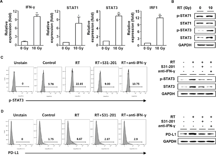 Figure 3: Upregulation of PD-L1 expression in tumor cells following radiation was IFN-γ-dependent. HCa-1 cells were treated with 10 Gy radiation for 24 h and cells were harvested for the measurement of mRNA expression by (A) real-time PCR (* P<0.05, ** P<0.01, one-way ANOVA). Phosphorylation and protein expression of STAT1 and STAT3 were measured by western blotting (B). S31-201 (50 μM) or anti-IFN-γ (10 μg/ml) was added 30 min before 10 Gy radiation. The phosphorylation and protein expression of STAT3 (C) and expression of PD-L1 (D) was measured by flow cytometry and western blotting. GAPDH was the loading control. Data are from three independent experiments.