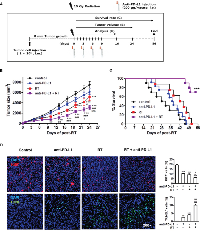 Figure 4: Combination of anti-PD-L1 and radiation increased antitumor effect in murine HCC model. (A) Experimental design for the combined treatment with anti-PD-L1 and radiation. (B) Tumor growth was measured twice per week following radiation and tumor size was shown as mean size ± SE. * P<0.05; ** P<0.01; *** P<0.001 compared with the control group; # P<0.05; ## P<0.01; ### P<0.001 compared with the anti-PD-L1 group; $ P<0.05; $$$ P<0.001 compared with the RT group (two-way ANOVA) (C) Survival rate was recorded as the percentage of surviving mice on a given day (*** P<0.001, log-rank (Mantel-Cox) test). Seven days after the last treatment, the tumors were removed. (D) Immunohistochemical analysis of the tumors stained with Ki67 and TUNEL (left, original magnification 200×). Quantitative analysis of Ki67+ and TUNEL+ cells among the indicated group (right). Data are from three independent experiments (n=5 per group). ** P<0.01; *** P<0.001 compared with the control group; ## P<0.01; ### P<0.001 compared with the anti-PD-L1 group; $ P<0.05; $$$ P<0.001 compared with the RT group (one-way ANOVA).