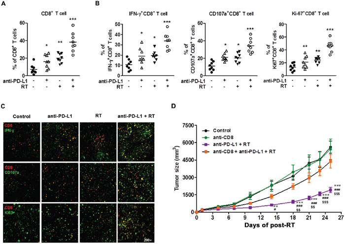 These data suggest that an infiltration of effector CD8+ T cells may be a major mechanism mediating the combined treatment effect. To investigate the importance of CD8+ T cells in combination therapy, we depleted mice of CD8+ T cells before treatment with combination therapy. Depletion of CD8+ T cells were performed by repeated injections of anti-CD8 antibody over the 3-day interval. When the mice were depleted of CD8+ T cells, effectiveness of combination therapy was abrogated, resulting in rapid tumor outgrowth (Figure 5D). These results show that CD8+ T cells were essential for therapeutic effect of combination therapy. Taken together, our data indicate that combination of anti-PD-L1 and radiation can restore CD8+ T cells to expand and regain their effector functions, which contribute to the therapeutic antitumor effect.