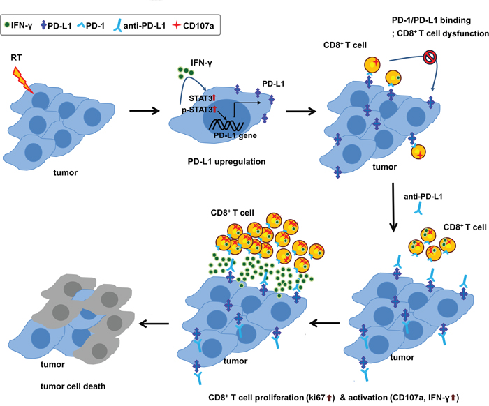 Results: Radiation upregulated PD-L1 expression in tumor cells through IFN-γ/STAT3 signaling, which could facilitate therapeutic action of anti-PD-L1. Combination of anti-PD-L1 and radiation significantly suppressed tumor growth compared to treatment with anti-PD-L1 alone or radiation alone group (P<0.01). Survival was significantly improved in the combination group compared to anti-PD-L1 alone or radiation alone group (7-week survival rate; 90% vs. 0% or 30%, respectively, P<0.001). The underlying mechanism involved increasing apoptosis, decreasing tumor cell proliferation, as well as restoration of CD8+ T cell functions.
