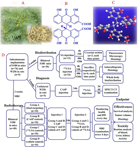 SA with a purity >98 %, was obtained by hydrolyzing sennoside A, which was separated from Senna angustifolia (TengWang pharmaceutical co. Ltd, Haozhou, China, Figure 1A). CA4P (HuaMei technology Co., Ltd, Wuhan, China), was diluted in phosphate buffered saline (PBS) solution (2.5 mg/ml). Sodium iodide (Na131I) was supplied by HTA Co., Ltd, Beijing, China. The specific activity was 740 MBq/mL and the radionuclidic purity was > 99%.