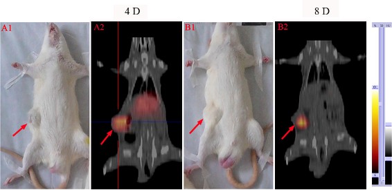 Figure 2: SPECT-CT images at 4 days (A2) and 8 days (B2) after i.v. injection of 131I-SA in W256 tumor-bearing rats. A1 and B1: corresponding gross photographs of unilateral tumor-bearing rats. Red arrows indicate tumor mass.
