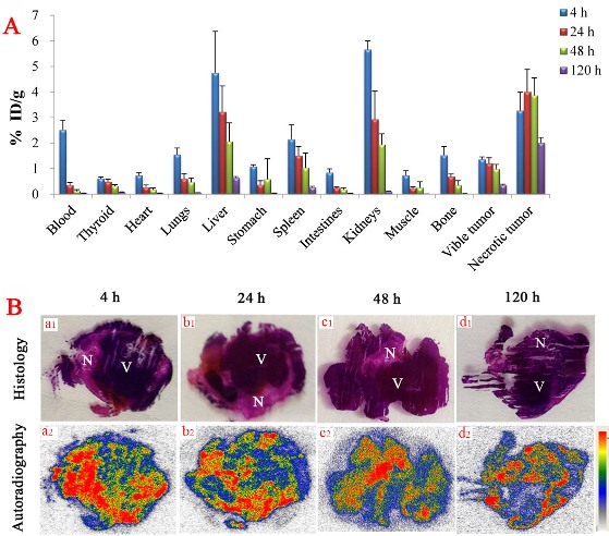 Figure 3: (A), biodistribution of 131I-SA studies in bilateral S180 tumor-bearing mice as a function of time (n=6, each time point). Data are expressed as percentage injected dose per gram of tissue (% ID/g). (B), autoradiograph and corresponding contrast-enhanced H&E images of 50-um tumor slices at 4 h (a1, a2), 24 h (b1, b2), 48 h (c1, c2) and 120 h (d1, d2) after i.v. injection of 131I-SA (18.5 MBq/kg). N = necrotic area, V = viable tumor area.