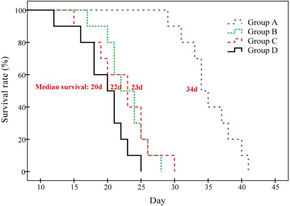 Figure 5: Kaplan-Meier survival curves show the survival probability (%) of the four groups of S180 tumor-bearing mice. The median survival was 34 (range 29-41), 22 (range 17-28), 23 (range 15-30) and 20 (range 12-25) days in group A, B, C and D respectively (P < 0.01 in group A vs. B, C or D; P > 0.05 between group B, C and D).