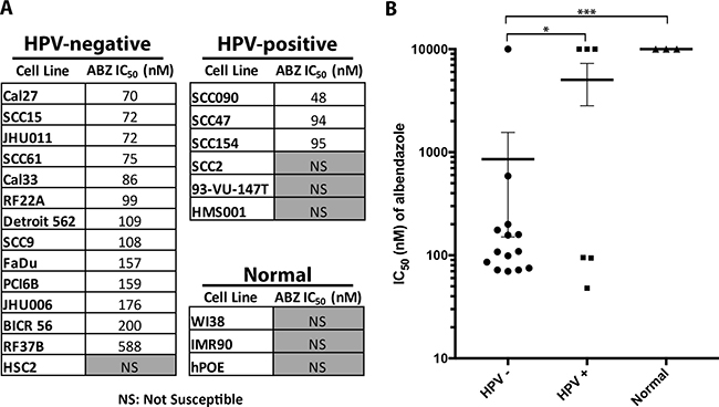 Figure 1: Albendazole inhibited the cell growth of HNSCC cell lines, with preferential activity in HPV-negative cell lines. (A) HPV-negative, HPV-positive and normal cell lines were tested against increasing doses of albendazole in order to calculate IC50 values. Cell lines that did not reach 50% viability at the maximum dose (10 μM) are denoted as NS (not susceptible). (B) Mean potency of albendazole for HPV-negative, HPV-positive and normal cell lines. Cell lines that did not reach IC50 were assigned a value of 10 μM (highest concentration tested) for statistical analysis. This potency trend suggests that albendazole demonstrates preferential activity in HPV-negative cell lines (unpaired t-test; p < 0.05). Error bars reflect standard error, *p < 0.05 and ***p < 0.001.