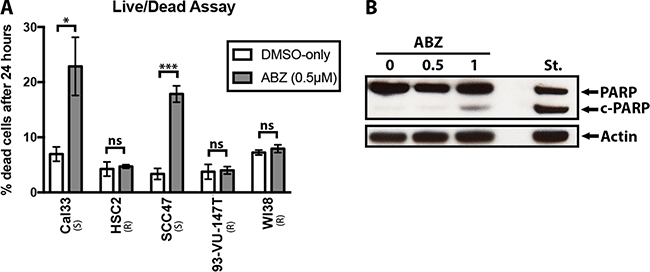 Figure 2: Albendazole caused cell death and apoptosis. (A) Live/dead assays were performed with Cal33, HSC2, SCC47, 93-VU-147T and WI38 cell samples that were exposed to vehicle (DMSO-only) or 0.5 μM of albendazole (ABZ) for 24 hours (four replicates per treatment). Albendazole treatment significantly increased the percentage of dead cells in susceptible cell lines (Cal33 and SCC47; paired t-test, p = 0.026 and p < 0.001 respectively), but yielded insignificant changes in HSC2, 93-VU-147T and WI38 cell lines. “(S)” marks the susceptible, and “(R)” marks the non-susceptible cell lines by IC50 analysis. Error bars show standard error, *p < 0.05 and **p < 0.01. (B) Cal33 cells were exposed to vehicle (DMSO-only), 0.5 μM or 1 μM ABZ for 24 hours, and immunoblotted for PARP. Staurosporine (St.) treatment was used as a positive control for apoptosis. Presence of cleaved PARP (c-PARP) at 1 μM albendazole treatment suggested that apoptosis was involved in cell death.