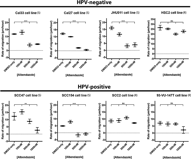 Figure 3: Albendazole impaired cell migration. Scratch assays were performed with 4 HPV-positive and 4 HPV-negative cell lines, exposed to various concentrations of albendazole, and imaged at 0, 2, 5, 8, and 12 hours post-treatment. Linear regression analysis was used to calculate the rate of growth (in μm/hour). Albendazole significantly reduced the rate of cell migration in cell lines that were susceptible in IC50 analysis, and led to no significant changes in migration rate in the non-susceptible cell lines (ANCOVA analysis, ns = not significant, **p < 0.01, ***p < 0.001). “(S)” marks the susceptible, and “(R)” marks the non-susceptible cell lines by IC50 analysis. Error bars represent standard error.