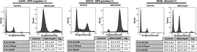 Figure 4: Albendazole induced cell cycle arrest at G2/M phase. Cal33 (HPV-negative), SCC47 (HPV-positive) and WI38 (normal) cells were exposed to vehicle (DMSO-only) or 0.5 μM albendazole (ABZ) for 24 hours (3 replicates per treatment, ± standard error is shown). BrdU and PI staining were carried out prior to flow cytometry analysis. “(S)” marks cells lines susceptible, and “(R)” marks cell lines not susceptible to albendazole in IC50 analysis. *p < 0.05, **p < 0.01, ***p < 0.001, and NS = not significant.