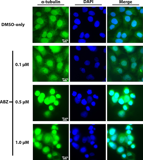 Cal33 cells were seeded and grown on glass coverslips and exposed to DMSO-only, 100 nM, 500 nM or 1 μM albendazole treatments for 24 hours. Three replicates of each treatment were prepared. Cells were fixed to the coverslips using 100% methanol (pre-chilled at –20°C). Samples were blocked using 5% normal donkey serum (Wisent) in PBS. Cells were then incubated for 1 hour with α-tubulin primary antibody (1:50, Cell Signaling Technology Cat. ID 2125) at room temperature, then washed extensively with PBS. Alexa Fluor® 488 goat anti-rabbit IgG secondary antibody (1:1000, Molecular Probes, Inc.A-11008) was added to each slide and then incubated in the dark for 60 minutes. DAPI (Molecular Probes, Inc., 30 nM) was used for nuclear staining. Images were obtained under 40x magnification using an Olympus Provis AX70 microscope.