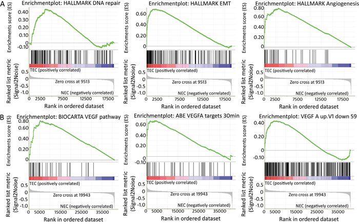 Figure 1: Enriched gene sets within TEC signature (GSEA). (A) Enrichment plots generated by the GSEA tool of the three most enriched gene sets of the MSigDb “hallmark gene set”. These are a priori defined gene sets that represent specific well-defined biological states or processes, i.e. from left to right, DNA repair, epithelial-mesenchymal transition and angiogenesis. In each analysis, genes within pre-defined gene sets are ranked and scored based on the position within the TEC-specific signature. In each plot, “1” corresponds to NEC and “2” to TEC. Each vertical line of the barcode represents a gene. Most genes on the left positively correlate with TEC samples, most genes on the right correlate negatively with TEC samples. Lines in between represent genes that are not differentially expressed between TECs and NECs. As vertical lines of the barcode are overrepresented at the left side of the graph, this means many of the genes within the pre-defined gene set are positively correlated/enriched within TECs. The score relating to this enrichment (enrichment score or ES) is indicated by the green line. (B) GSEA enrichment plots show enrichment of genes involved in VEGF signalling in TEC samples. The first plot corresponds to genes assigned to the VEGF pathway by the Biocarta database, the second and third plot correspond to published data of genes up-or downregulated after treatment of HUVEC cells with VEGFA (Pubmed 12197474 respectively Pubmed 15516835) [64, 65].