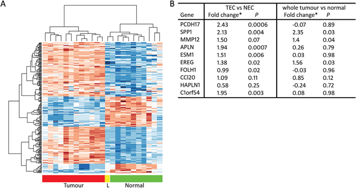 Figure 2: TEC-specific signature. (A) Heatmap showing hierarchical clustering of the 200 most significantly differentially expressed probe sets between TEC and NEC. Samples are depicted on the horizontal axis, genes on the vertical axis. “L” means liver metastasis. Within the heatmap, red is highly expressed and blue is lowly expressed. (B) Table representing microarray Limma fold changes and FDR-corrected p-value of TEC-specific candidate genes comparing TEC with NEC samples, as well as Limma fold changes and FDR-corrected p-value comparing whole tumour and normal tissues.