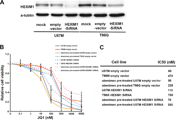 Figure 2: (A) Western Blot was carried out to test HEXIM1 knock down in U87M and T98G glioma cell lines. (B) WST-1 cell proliferation assay was used to test the effect of HEXIM1 on JQ1 sensitivity. (C) IC50 of JQ1 on all 3 groups.