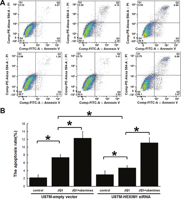 Figure 3: Annexin V-PI staining assessing U87M mock control and U87M HEXIM1 knockdown cells’ apoptosis rates after JQ1 or JQ1 combined ubenimex treatment. JQ1 induced apoptosis in U87M cells, the effect attenuated by the downregulation of HEXIM1, indicating the role of HEXIM1 on JQ1 sensitivity. Ubenimex enhanced both mock control and HEXIM1 knockdown cells' JQ1 sensitivity. (A) Flow-cytograms; (B) quantitation of a (*P < 0.05).