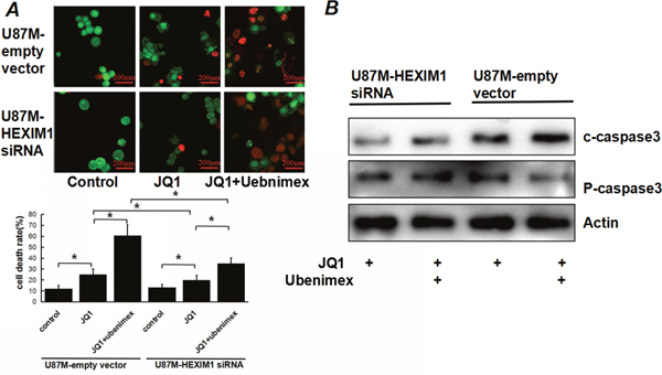 Figure 4: JQ1 induced apoptosis in U87M cells, the effect was attenuated by knocking down HEXIM1. (A) U87M (mock and HEXIM1 knock down) cells were treated with JQ1 alone or combine with ubenimex at a dose of 0.5 mg/ml for 16 h. We used fluorescence microscopy to examine DNA damage and cell death. The dead cells (red) per field determined by acridine orange staining are shown. (B) Western Bolt of caspase3 (c-capase3:cleaved caspase3; P-caspase3:pro-caspase3)showed the same trend of JQ1 or JQ1+unbenimex induced apoptosis.* P<0.05. Data are expressed as the mean ± standard deviation of 3 independent experiments.