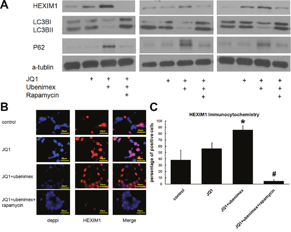 Figure 5: (A) Western Blot showed JQ1 or JQ1 combined ubenimex treatment on HEXIM1 and autophagy marker LC3B, P62 expression. Pharmacologic autophagy stimulator Rapamycin (10nm) attenuated this effect on degradation of HEXIM1. (B) Immunofluorescence staining of HEXIM1 on JQ1 or JQ1 combined ubenimex treatment on U87M cells. (C) Quantitation of B. *: P<0.05 vs control. #, P<0.05 vs JQ1+ubenimex.