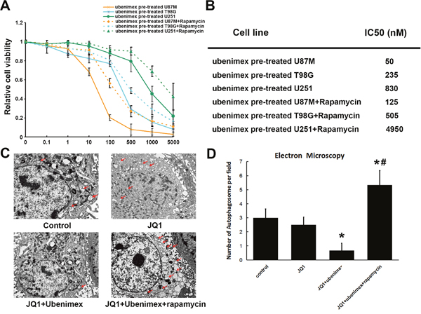 Figure 6: (A) WST-1 cell proliferation assay were used to test the effect of autophagy on JQ1 sensitivity. (B) IC50 of JQ1 showed autophagy stimulated by rapamycin attenuated ubenimex enhanced JQ1 sensitivity. (C, D) Number of autophagosome were observed by using electron microscopy. Data showed ubenimex significantly inhibited autophagy of U87M glioma cells.*: P<0.05 vs control. #: P<0.05 vs JQ1+ubenimex.