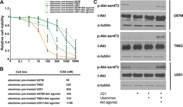 Western blot showed that ubenimex treatment significantly reduced the concentration of phosphorylated proteins involved in the Akt signaling pathways (p-Akt-ser437), (Figure 7C). We designed a test to verify whether the Akt pathway is involved in JQ1 sensitivity in glioma cells. The WST-1 assay showed that treatment with an Akt agonist (10 nM) compromises JQ1 efficacy (P<0.01, Figure 7A). It also verified that ubenimex improved JQ1 sensitivity was attenuated after stimulating the Akt pathway using the Akt agonist (P<0.05, Figure 7A). The IC50 of JQ1 combined with the Akt agonist treatment shifted from 50nM to 100nM for U87M; from 235 nM to 510 nM for T98G and from 830nM to 1100nM for U251 (Figure 7B). The Akt agonist attenuated the ubenimex-enhanced JQ1 sensitivity suggesting that suppression of the Akt pathway by ubenimex is involved in JQ1sensitivity in glioma cells.