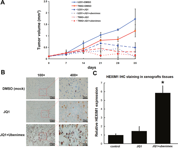 Figure 9: (A) Subcutaneous injection of 5×106 U251 or T98G cells per nude mouse was carried out. At 2 weeks (set as day 0), treatment was initiated and tumor lengths and widths were measured every 7 days. Tumor volume was derived as length × width 2/2. JQ1 at 30 mg/kg daily inhibited tumor growth; Combine with ubenimex significantly enhanced JQ1 efficiency. (B) HEXIM1 IHC staining was carried out, data showed HEXIM1 expression significantly improved after JQ1+Ubenimex treatment. (C) Quantitation of B (*P < 0.05 vs control).