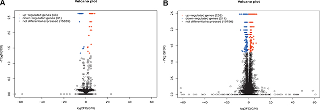 Figure 1: Volcano spot of lncRNA and mRNA expression in stomach adenocarcinoma. (A) volcano spot of lncRNA expression in cancer group and control group; (B) volcano spot of mRNA expression in cancer group and control group. C indicated stomach adenocarcinoma and N indicated adjacent non-tumor samples. Red spot and blue spot respectively indicated up- and down-regulated genes in stomach adenocarcinoma.