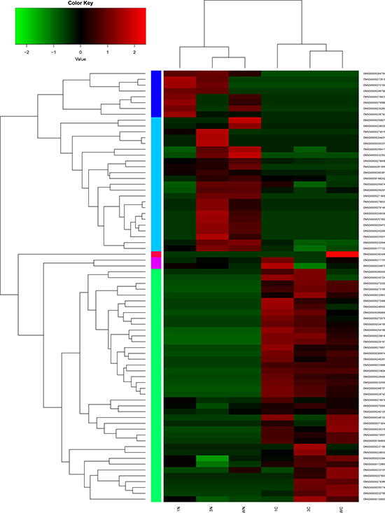 Figure 2: Hierarchical clustering analysis of the expression levels of DElncRNAs in stomach adenocarcinoma and adjacent non-tumor tissues. Row and column represented DElncRNAs and tissue samples. The color scale indicated log10FPKM of the expression levels of DElncRNAs. Red and green indicated up- and down-regulation. C represented stomach adenocarcinoma tissues and N represented adjacent non-tumor tissues.