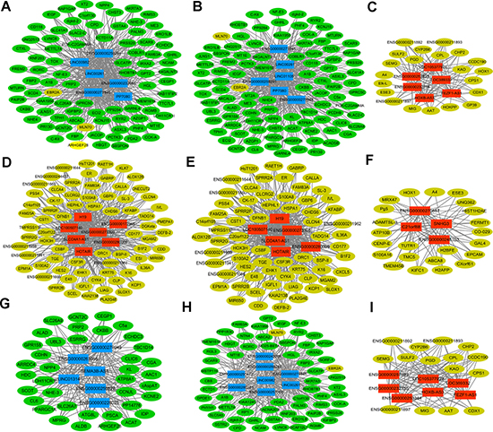 In accordance with the previous studies, lncRNA H19 and lncRNA HOTAIR were up-regulated and LINC00261 was down-regulated in stomach cancer. In our data, H19 and HOTAIR was up-regulated with 23.5 and 17.5 fold in STAD, respectively. H19 co-expressed with 72 DEmRNAs and 6 DElncRNAs (Figure 4D). Increased expression of H19 contributes to tumor suppressor p53 inactivation in stomach cancer, which promotes cell proliferation, migration, invasion and metastasis in stomach cancer [19, 20]. Increased H19 is significantly correlated to advanced TNM stage and lymph node metastasis, while leads to poorer overall survival in patients with STAD [21]. Circulating H19 is up-regulated in plasma of patients with STAD compared to healthy controls and it might be promising biomarker of STAD patients [22]. In the DElncRNA/DEmRNA co-expression network, HOTAIR positively correlated with 67 DEmRNAs and 5 DElncRNAs, such as H19 (Figure 4E). Over-expression of HOTAIR promotes the epithelia-to-mesenchymal transition, cell invasion, cell metastasis and it is associated with unfavorable survival of patients with STAD [23–26].