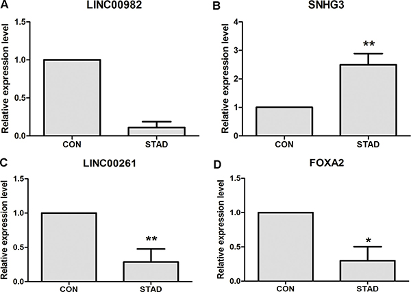 Figure 5: qRT-PCR validation of dysregulated DElncRNAs and DEmRNAs in STAD compared with matched non-tumor tissues. (A) The expression level of lncRNA LINC00982; (B) The expression level of lncRNA SNHG3; (C) The expression level of lncRNA LINC00261; (D) The expression level of FOXA2. STAD indicated stomach adenocarcinoma; CON indicated paired adjacent non-tumor tissues. * represented P < 0.05 and ** represented P < 0.01.