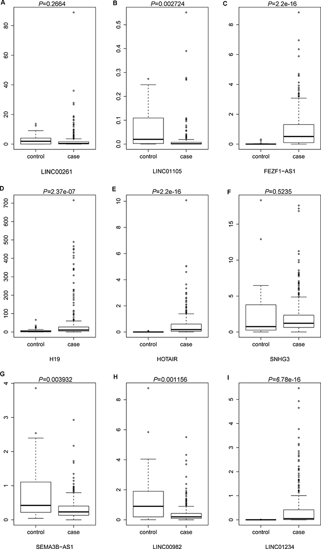Figure 6: The cross validation of the expression levels of candidate DElncRNAs in STAD tissues based on TCGA database. (A) LINC00261; (B) LINC01105; (C) FEZF1-AS1; (D) H19; (E) HOTAIR; (F) SNHG3; (G) SEMA3B-AS1; (H) LINC00982; (I) LINC01234. Case group and control group indicated STAD tissues and adjacent non-tumor tissues.