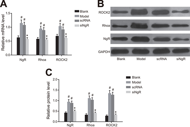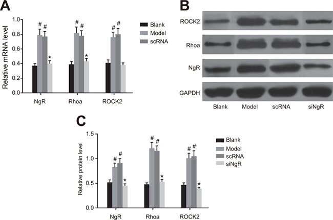 Figure 4: The effect of NgR silencing on RhoA signaling pathway in NMDA-treated mRGCs. (A) The expression of NgR, RhoA and ROCK2 mRNAs was determined by qRT-PCR in the 4 groups of mRGCs cultured for 3 days. (B) Western blotting analysis of protein expression of NgR, RhoA and ROCK2 in the 4 groups of mRGCs cultured for 3 days. (C) The gray values for NgR, RhoA and ROCK2 proteins in the 4 groups of mRGCs is shown. #P < 0.001 as compared with the blank group; *P < 0.001 as compared with the model and nscRNA groups; mRGC, mouse retinal ganglion cells; qRT-PCR, quantitative real-time polymerase chain reaction.
