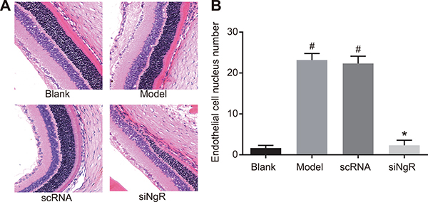 Figure 7: The effects of NgR gene silencing on angiogenesis in NMDA-treated murine retinal tissues. (A) The arrangement of mRGCs in the H&E stained retinal tissue sections from the 4 groups of mice is shown. (B) The numbers of vascular endothelial cell nuclei that broke through the inner limiting membrane of the retina in the 4 groups were quantified (400X; black arrows represent endothelial cell nuclei). #P < 0.001 compared with the blank group; *P < 0.001 compared with the model and nscRNA groups; H&E, hematoxylin and eosin.