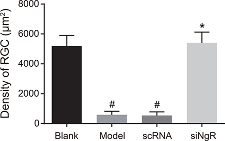 Figure 8: The effects of NgR gene silencing on mRGC cell density in NMDA-treated murine retinal tissues. The number of mRGCs per unit area in the retinas of the 4 group of mice is shown. #P < 0.001 compared with the blank group; *P < 0.001 compared with the model and nscRNA groups; mRGCs, mouse retinal ganglion cells.